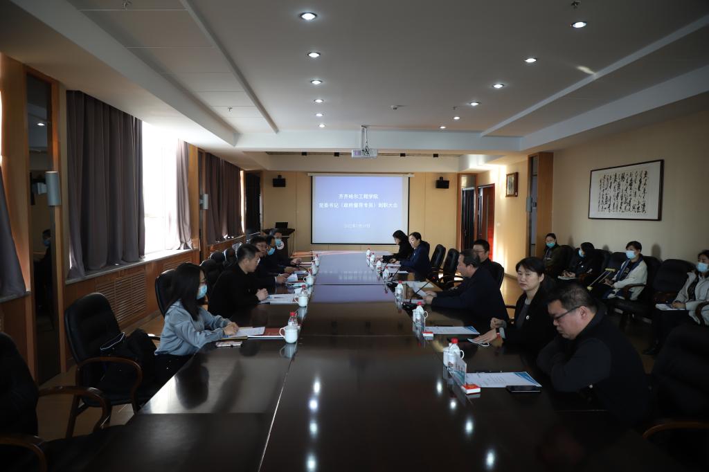 1月19日,在图书馆603南会议室学校召开省委教育工委派驻齐齐哈尔工程学院党委书记(政府督导专员)郭伟东同志到职大会。