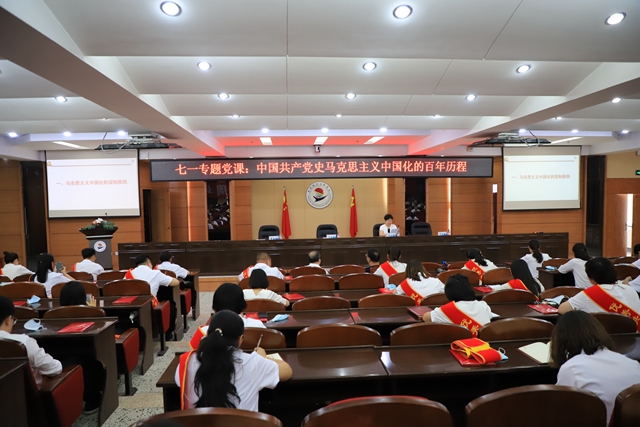 为贯彻落实省委教育工委党史学习教育部署,按照校党委开展党史学习教育实施方案的要求,6月30日下午,校党委书记张长娟在学校召开庆祝中国共产党成立100周年暨“两优一先”表彰奖励大会后,作题为《中国共产党史—马克思主义中国化的百年历程》专题讲座。党委委员、副院长蒋春艳主持讲座,校领导,各党总支和直属党支部书记、基层党支部书记和委员,师生党员代表,新党员代表等参加。张长娟书记从马克思主义中国化的深刻原因、历史进程、伟大成就、宝贵经验四个方面阐述了中国共产党的百年历程和历史经验。