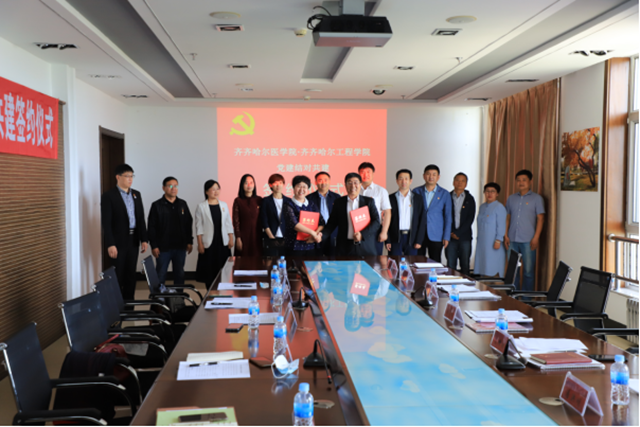 齐齐哈尔医学院党委书记顾长虹,党委常委、组织部部长肖锋刚,党委常委、宣传统战部部长张宝林,共建党组织书记与我校党委书记张长娟、党委组织部部长乔亚男、党委宣传部副部长郭伟伟、共建党组织书记出席签约仪式。