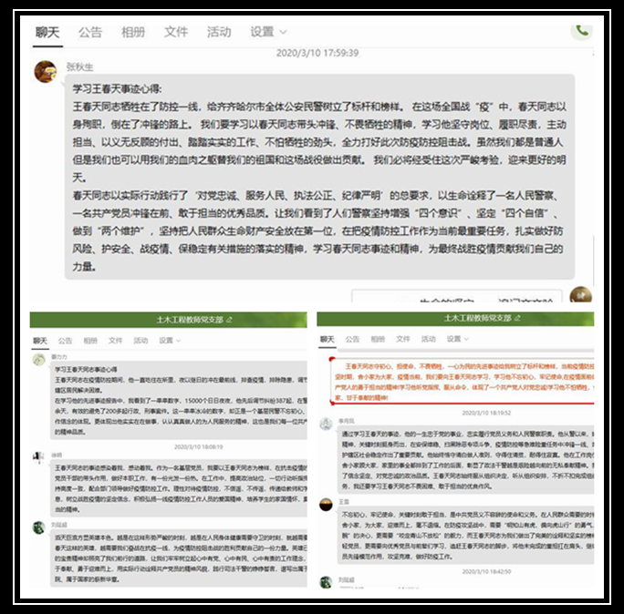3月12日,工程管理专业教师党支部书记张好徽组织党员学习王春天先进事迹并进行网络交流,分享学习心得。大家表示,要学习王春天同志信念坚定、对党忠诚的政治品质,全心全意为人民服务,真正做到不忘初心、牢记使命,在疫情防控期间,认真上好每一堂在线教学课,注重做好学生的思想引导和学习辅导。