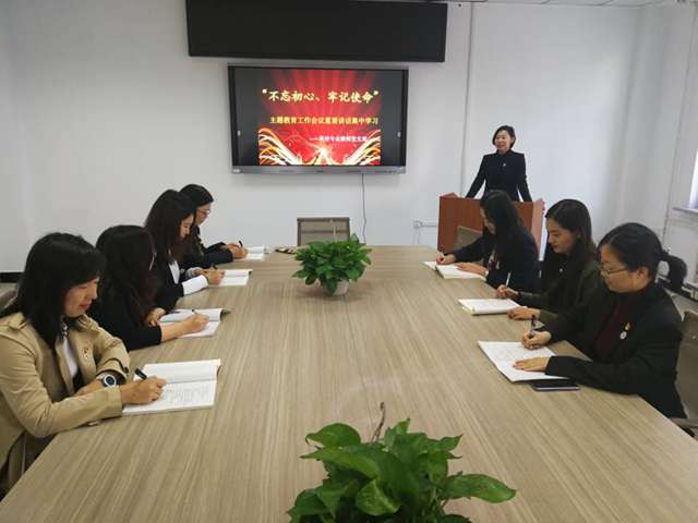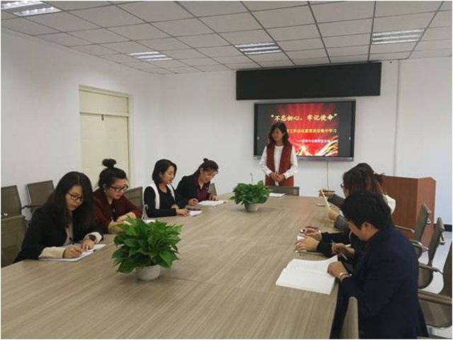 9月19日上午,英语专业教师党支部书记赵丹丹主持召开会议,向全体党员传达习近平总书记在“不忘初心、牢记使命”主题教育工作会议上的重要讲话精神、中央、省委、市委以及学院党委“不忘初心、牢记使命”主题教育部署会议精神,要求党员教师对照目标查找自身差距,努力提高课程思政能力,真正落实好育人工作。党员们纷纷表示,要深入学习习总书记讲话精神,积极参加主题教育,牢记教书育人初心和使命,找准差距、狠抓落实。