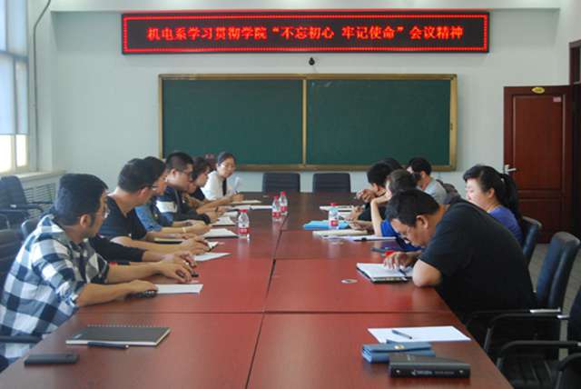 9月12日下午,机电工程系党总支书记高爱利主持会议,向全体党员传达习近平总书记在“不忘初心、牢记使命”主题教育工作会议上的重要讲话精神、张庆伟书记在全省“不忘初心、牢记使命”主题教育第一批总结暨第二批部署会议上的讲话精神、市委书记孙珅在全市“不忘初心、牢记使命”主题教育工作会议讲话精神和学院党委主题教育工作部署会议精神后,要求党总支所属4个党支部把主题教育工作与学院党委组织开展的红旗党支部竞赛结合起来,与迎评促建结合起来,从严从实落实好学院党委的对主题教育工作的部署和要求。