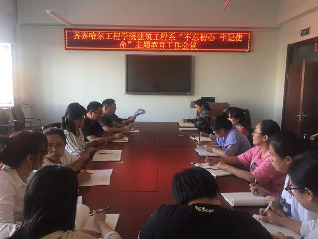 9月12日下午,建筑工程系党总支召开专门会议,及时向全体党员传达学院党委“不忘初心、牢记使命”主题教育工作部署会议精神和要求。系党总支书记王丽萍在会上传达了中央、省委、市委和学院党委“不忘初心、牢记使命”主题教育部署会议精神,要求各党支部和全体党员立足本专业和本班级,深入开展“不忘初心、牢记使命”主题教育,把主题教育与迎评促建结合起来,两不误、两促进,为学院发展建设作出应有的贡献。