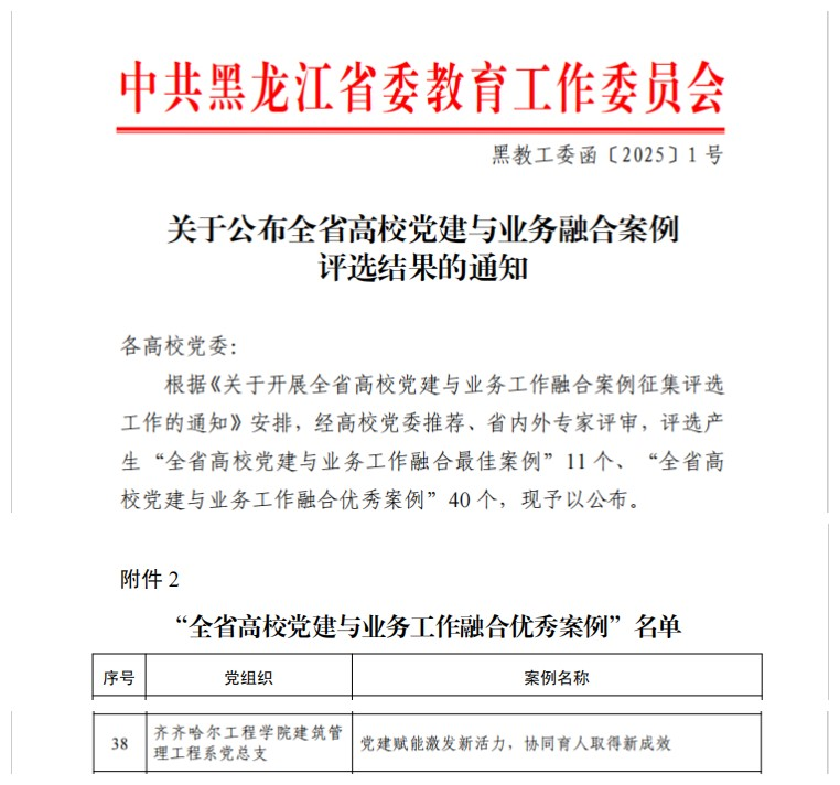 2024年10月,党委组织部组织开展了校级党建与业务融合优秀案例评选活动,经过严格评审,最终评选出一等奖1个、二等奖1个、三等奖2个及优秀奖4个。在此基础上,我校建筑管理工程系党总支的《党建赋能激发新活力,协同育人取得新成效》案例脱颖而出,并被推荐参评黑龙江省委教育工委组织的全省高校党建与业务融合案例评选。2025年1月13日,省委教育工委公布了评选结果,我校该案例获评优秀,充分展示了我校党建与业务融合工作的成效。