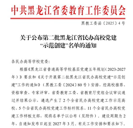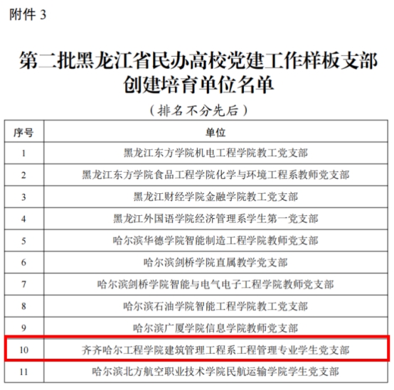 近日,黑龙江省委教育工委公布全省第二批民办高校党建“示范创建”评审结果,建筑管理工程系工程管理专业学生党支部获批党建工作“样板支部”培育创建单位。